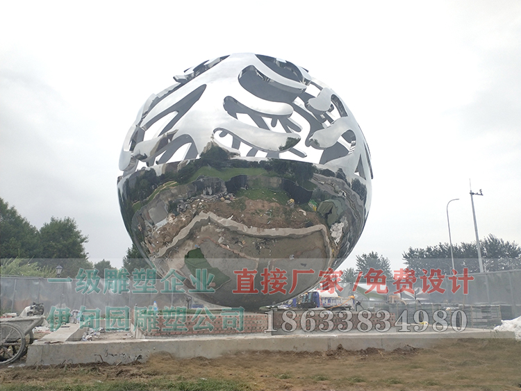 不銹鋼鏤空球體直徑8米,不銹鋼+石材基座組合。雕塑球體采用不銹鋼304鏡面效果表現,使雕塑表面像鏡子一樣清晰,整體美觀(guān),可以反射周?chē)坝^(guān),擴大視覺(jué)效果,還原不銹鋼本色。結合LED燈光散發(fā)藝術(shù)氣息,增強與公眾的互動(dòng),增加與城市文明的情感聯(lián)系,豐富城市精神文明。