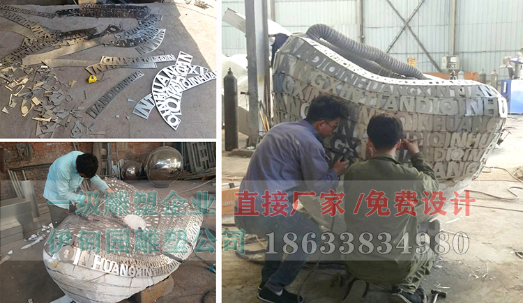 漫想雕塑制作流程:3D圖紙設計→翻制玻璃鋼磨具→剪切字母圖樣→焊接修復成型。