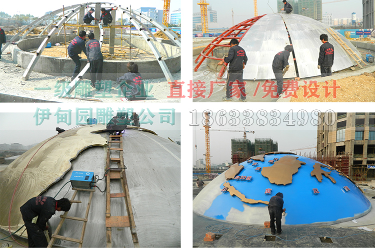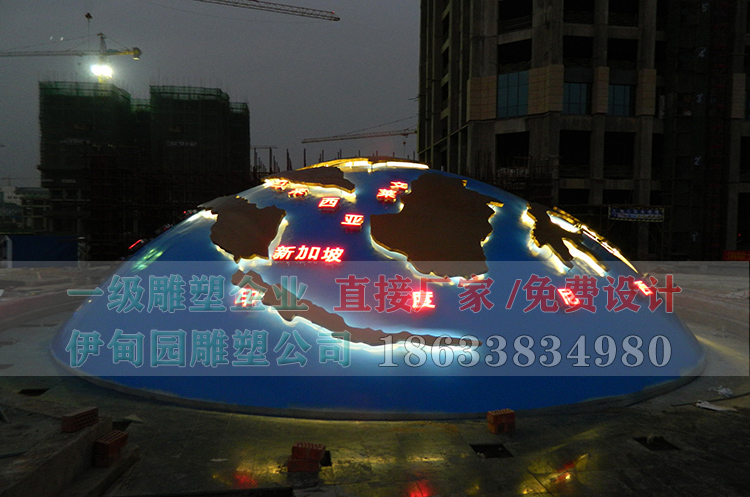 半個(gè)不銹鋼地球儀直徑11米,安裝于廣西省崇左市某單位門(mén)口。不銹鋼雕塑采用鍛造工藝技術(shù),內部鋼結構支撐,內置燈光,整體焊接、白天自有景觀(guān)雕塑夜晚又是一奇景,帶有時(shí)尚的現代景觀(guān)感。