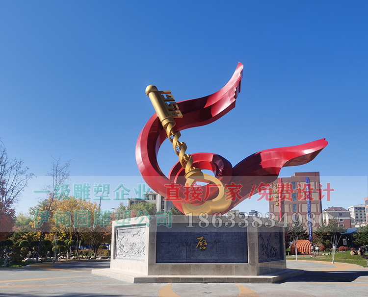 60周年校慶主題雕塑凸出我校1958年建校,由DNA鑰匙和飄逸的彩帶組成,校慶雕塑,以校園DNA研究為設計主題,鑰匙與DNA的組成,預示開(kāi)啟醫學(xué)研究的大門(mén);隨風(fēng)勁舞的彩帶象征自由與成功。