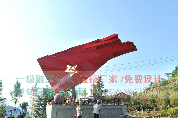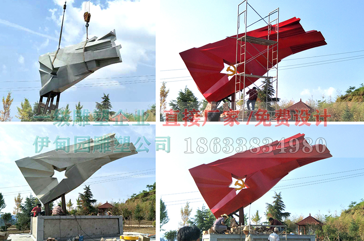 不銹鋼黨旗雕塑尺寸:長(cháng)7.2x高5.5m,安裝于河南省某公園。制作工藝流程:小稿打印→圓管放樣→鍍鋅骨架→板材鍛造→造型拼接→焊接打磨→環(huán)氧底漆→氟碳面漆→運輸安裝。