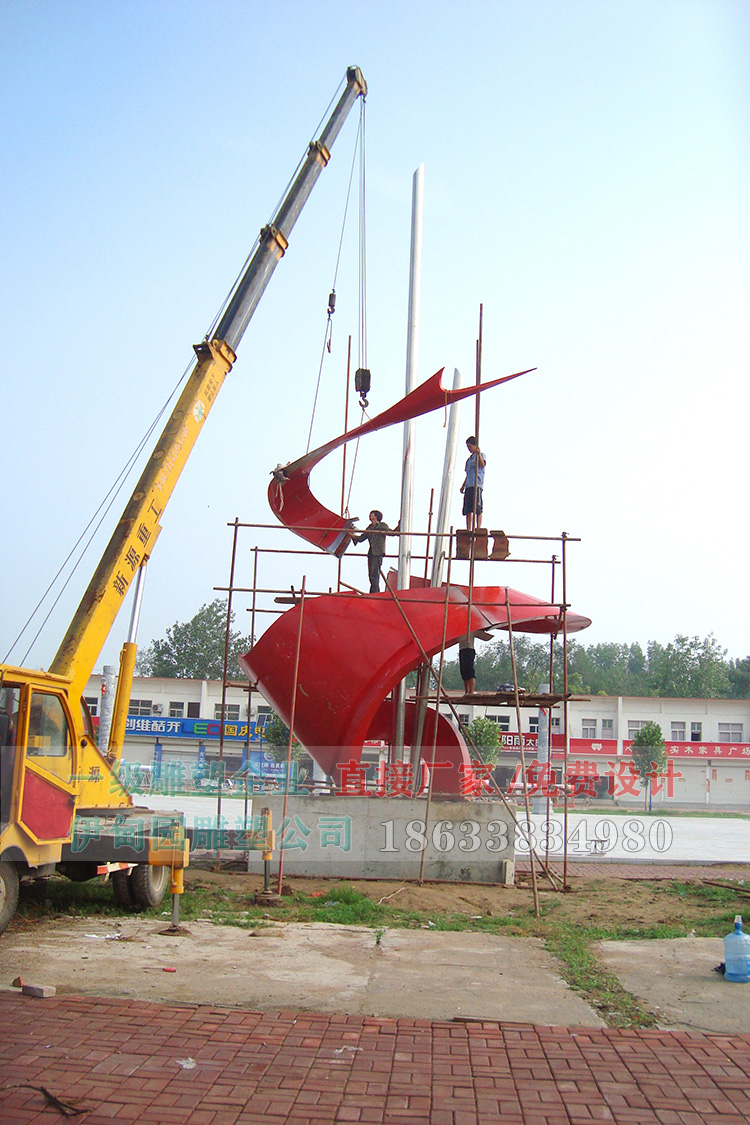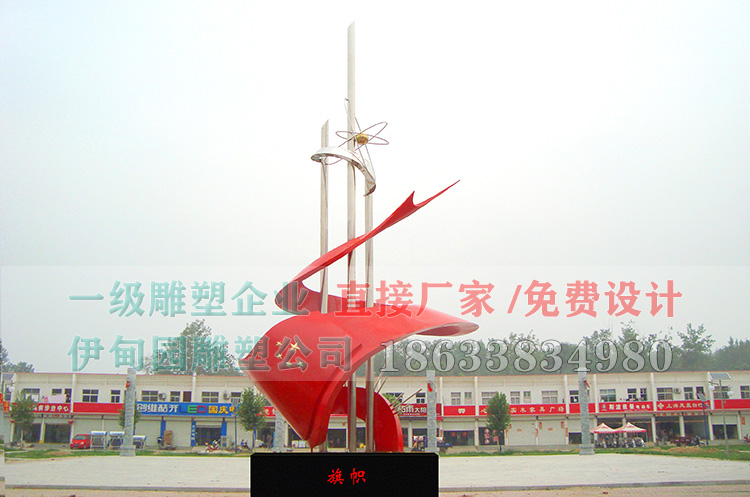 藝術(shù)紅旗不銹鋼雕塑運用抽象設計理念,提升雕塑整體的藝術(shù)感,造型新穎飄逸,增強紅旗雕塑強烈的視覺(jué)效果。紅旗不銹鋼雕塑蘊含的深厚感情及不朽的藝術(shù)生命力獨立于世,與城市的公共文化相結合。