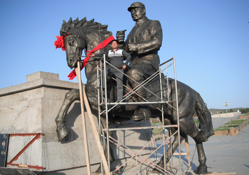 人物雕塑制作完成后,根據其材料(紅銅、黃銅)的不同性質(zhì),選擇合適的方法進(jìn)行表面處理。如:紅銅的清洗,首先需要用稀釋的硫酸液將紅銅表面進(jìn)行刷洗,除去人物雕塑表面的油污、銹垢,然后用自來(lái)水沖洗掉具有腐蝕性的稀硫酸,這樣就可以為人物雕塑進(jìn)行表面著(zhù)色。先將化學(xué)藥劑倒入玻璃容器中,然后用干凈的毛刷將化學(xué)藥水涂刷在人物雕塑表面進(jìn)行化學(xué)腐蝕,稍后等色彩附著(zhù)在雕塑表面后,用銅刷拋刷,其后用清水洗凈擦干,上光、打蠟、保護其表面,最終完成人物雕塑制作。